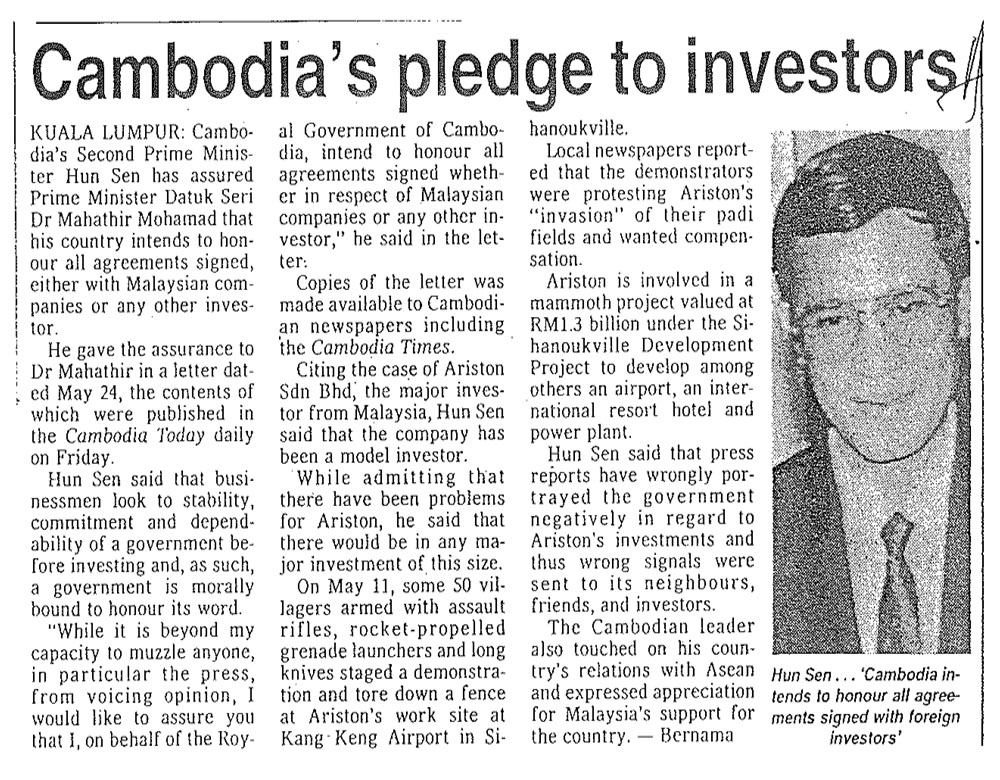 The RGC invited international bids for an infrastructure-tourism project in Sihanoukville, southern Cambodia. Ariston, a Malaysian company owned by our founder and controlling shareholder, the late Dr Chen, was selected as the preferred bidder by the consultants after thorough screening and interviews.