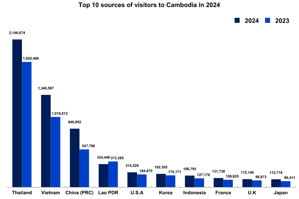 - International business-related travels into Cambodia increased by 37.8% YoY to 1,393,198 visitors in 2024, with the top 5 markets coming from China (41.9%), Vietnam (21.8%), Indonesia (8.2%), Thailand (5.3%) and Taiwan (3.4%), representing a recovery rate of 101.6% compared to the same period in 2019