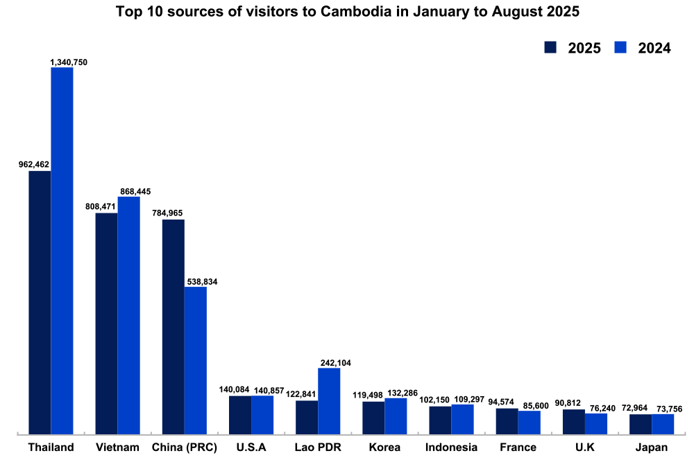 - International business-related travels to Cambodia increased 18.5% YoY to 1,059,944 visitors in the first eight months of 2025, with the top 5 markets coming from China (46.4%), Vietnam (19.5%), Indonesia (6.3%), Thailand (4.7%) and Taiwan (3.5%), representing a recovery rate of 107.9% compared to the same period in 2019. For the month of August 2025, international business-related travels into Cambodia saw a sequential MoM increase of 15.3% to 110,538 visitors compared to the month of July 2025