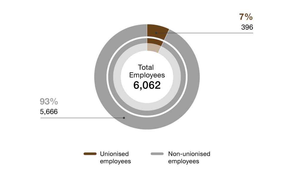 In 2024, from our total workforce of 6,062 employees, 7% chose union membership, while 93% were without union affiliation. Each union operating in our workplace are registered with the Ministry of Labour and Vocational Training (“MoLVT”), meeting all regulatory requirements.