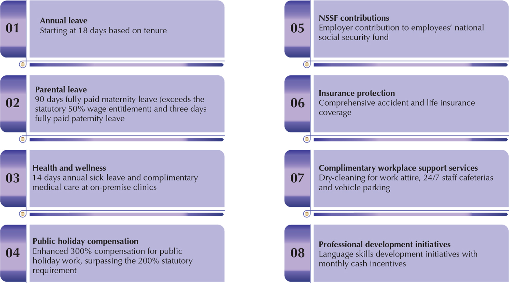 We maintained our commitment to employees’ long-term social security through contributions to national pension and social security schemes that apply to our workforce. With the majority of our workforce based in Cambodia, the National Social Security Fund (“NSSF”) plays a crucial role in safeguarding our employees’ well-being by providing essential healthcare benefits and retirement security.