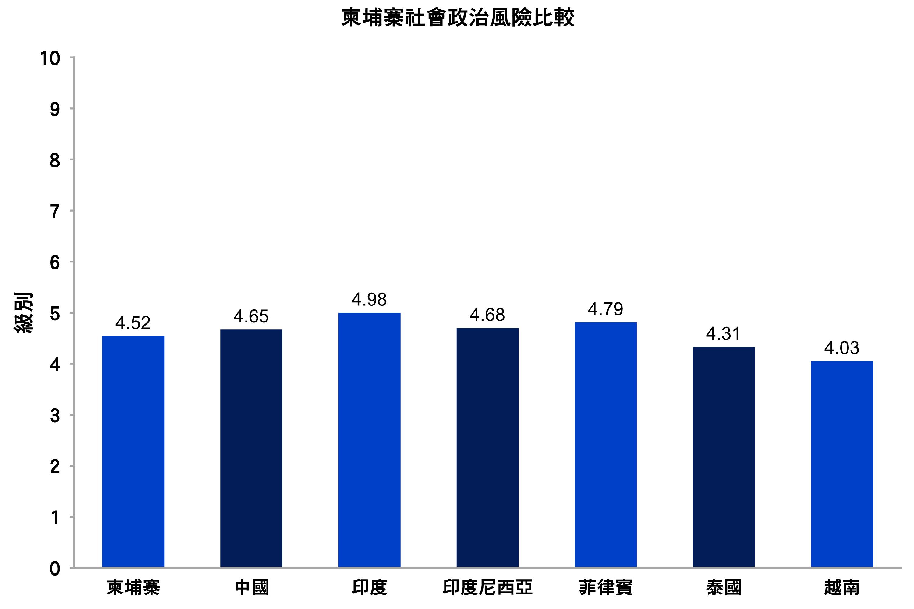 柬埔寨的政治及社會狀況穩定、風險較低,而住宅房地產、金融及出口導向型製造業等領域的經濟風險相比旅遊業及農業等其他領域更高。