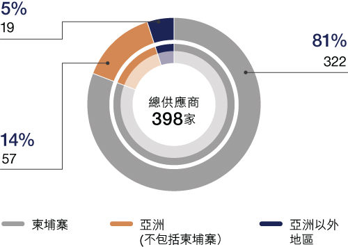 我們優先考慮當地採購,原因是此舉將對我們的社區造成多重社會經濟影響,能夠支持我們開展業務所在地柬埔寨的中小企業發展、改善民生及創造就業機會。由於運輸過程中溫室氣體排放量較低,因而當地採購更為環保。於二零二四年,根據供應商數據,我們81%的供應商來自柬埔寨及95%的供應商來自各地區(包括柬埔寨)。