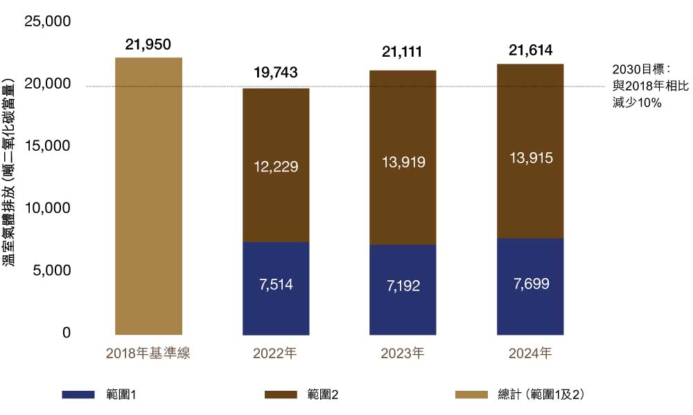 與我們將範圍1 及2 的溫室氣體排放較二零一八年基準線減少10%的二零三零年目標相比,二零二四年的範圍1 及2 溫室氣體排放減少2%。作為我們持續評估的一部分,我們將繼續識別減少我們碳足跡的機會。