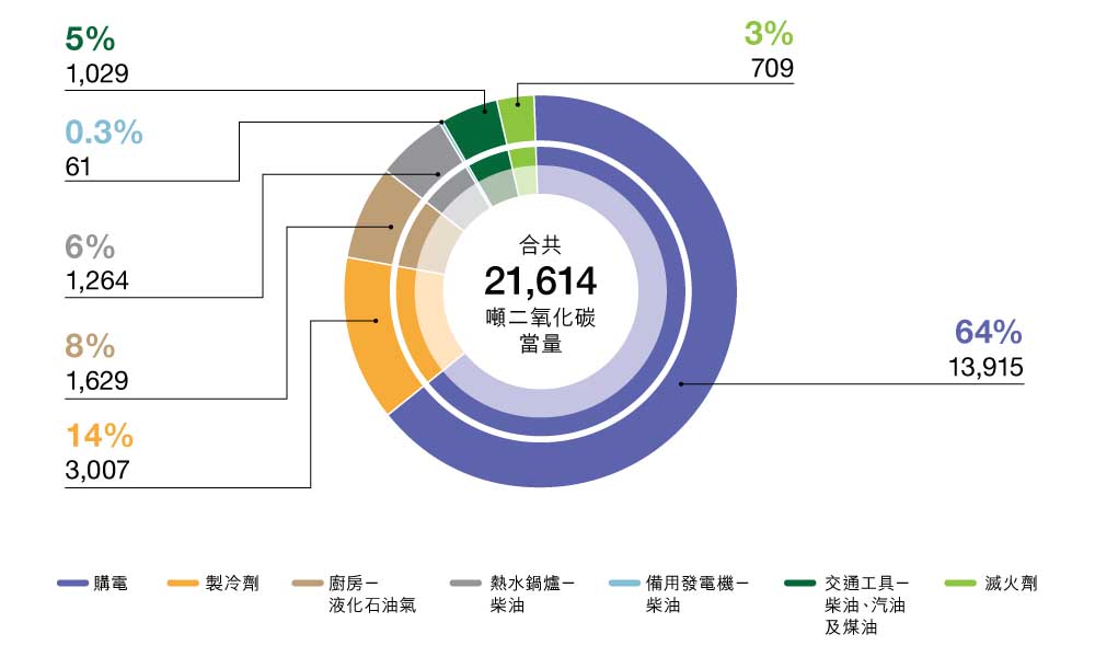 於二零二四年,我們範圍1 及2 的溫室氣體排放總量較二零二三年增加2.4%。該增加乃由於二零二四年來自滅火劑的範圍1 溫室氣體排放的新披露。否則,範圍1 和2 温室氣體排放量將減少1%。在年內業務量有所改善的背景下,廚房液化石油氣的使用量和車輛燃料的使用量有所增加。我們設法減少了製冷劑的使用,並保持了與二零二三年類似的用電量。我們的節能舉措繼續降低能源消耗和溫室氣體排放。