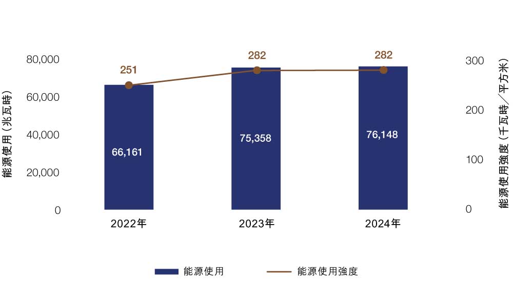 與二零二三年相比,二零二四年我們的總能源消耗略微上升了1%。該增長主要是由於廚房液化石油氣使用量增加和車輛燃料使用量增加, 反映了二零二四年業務量的增加。 與我們將電力使用量由二零一八年基準線減少25%的二零三零年目標相比,二零二四年的用電量減少了10%。