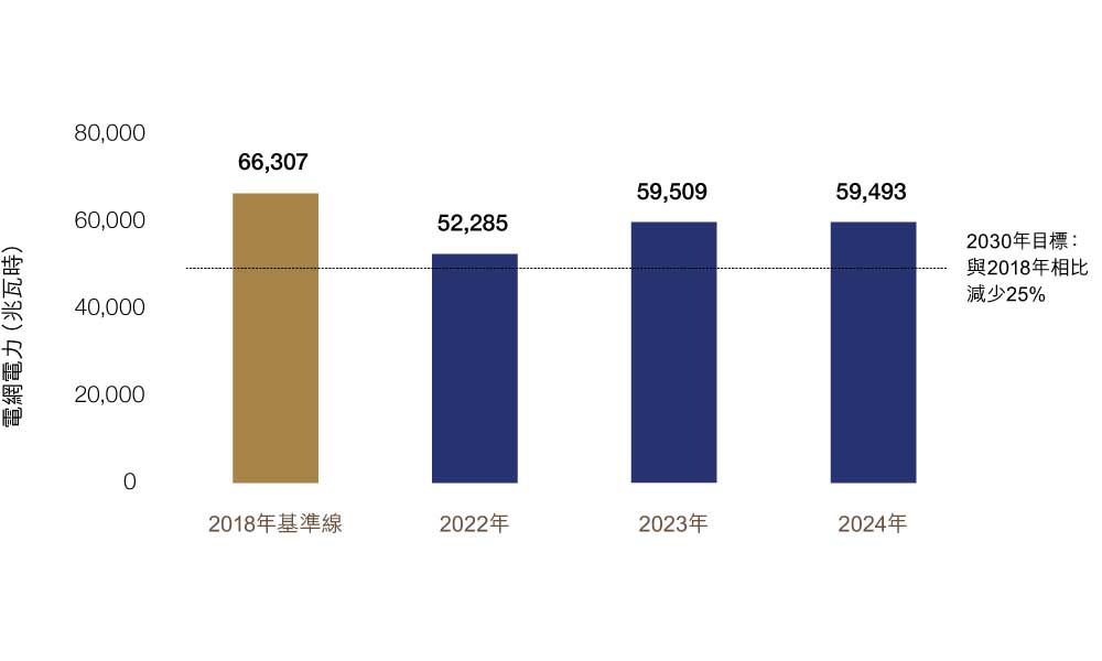 | 能源 | 電網電力使用量較二零一八年基準線減少25% | ▼10% | ▲3% | 密切監察 |