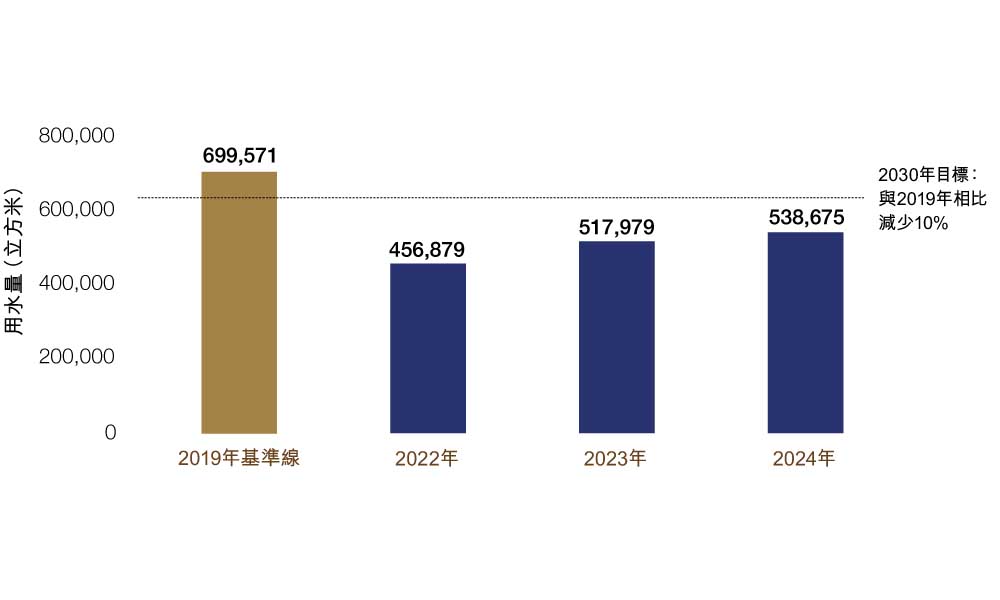 | 水資源 | 用水量較二零一九年基準線減少10% | ▼23% | ▲19% | 進行中 |