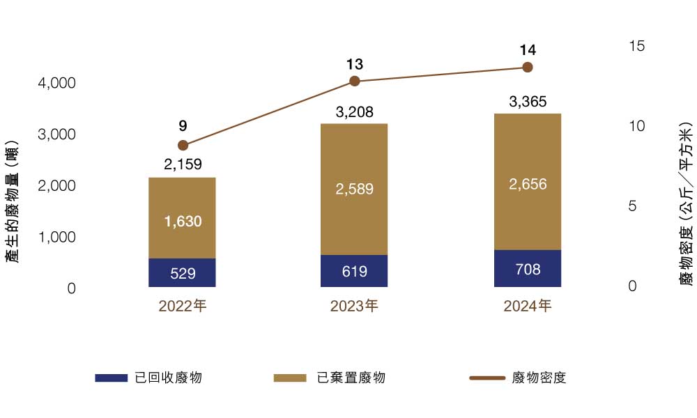 總體而言,由於商業活動增加,二零二四年產生的廢物總量較二零二三年增加了5%。回收廢物增加了14%,而非回收廢物增加了3%。在從垃圾填埋場分類廢物方面,我們實現了21% 的廢物分類率, 較二零二三年的19%有所提高。