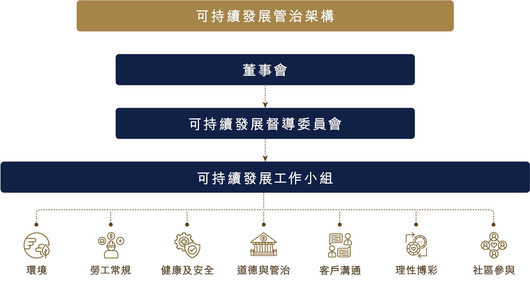 可持續發展管治架構乃於二零二三年設立並於二零二四年二月獲得董事會批准,明確了在董事會、管理層及部門層面的角色及責任,以識別、監控、報告及改善我們的環境、社會及管治表現及對環境、社會及管治風險及機遇的監督。